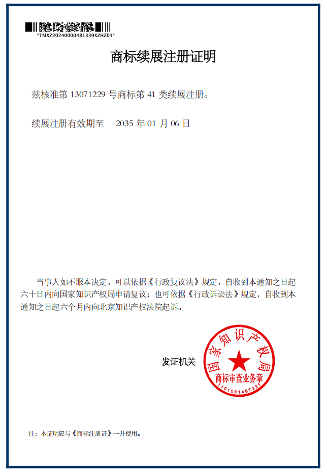 ![]() 商标续展注册证明 |